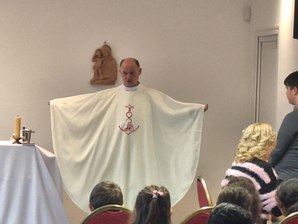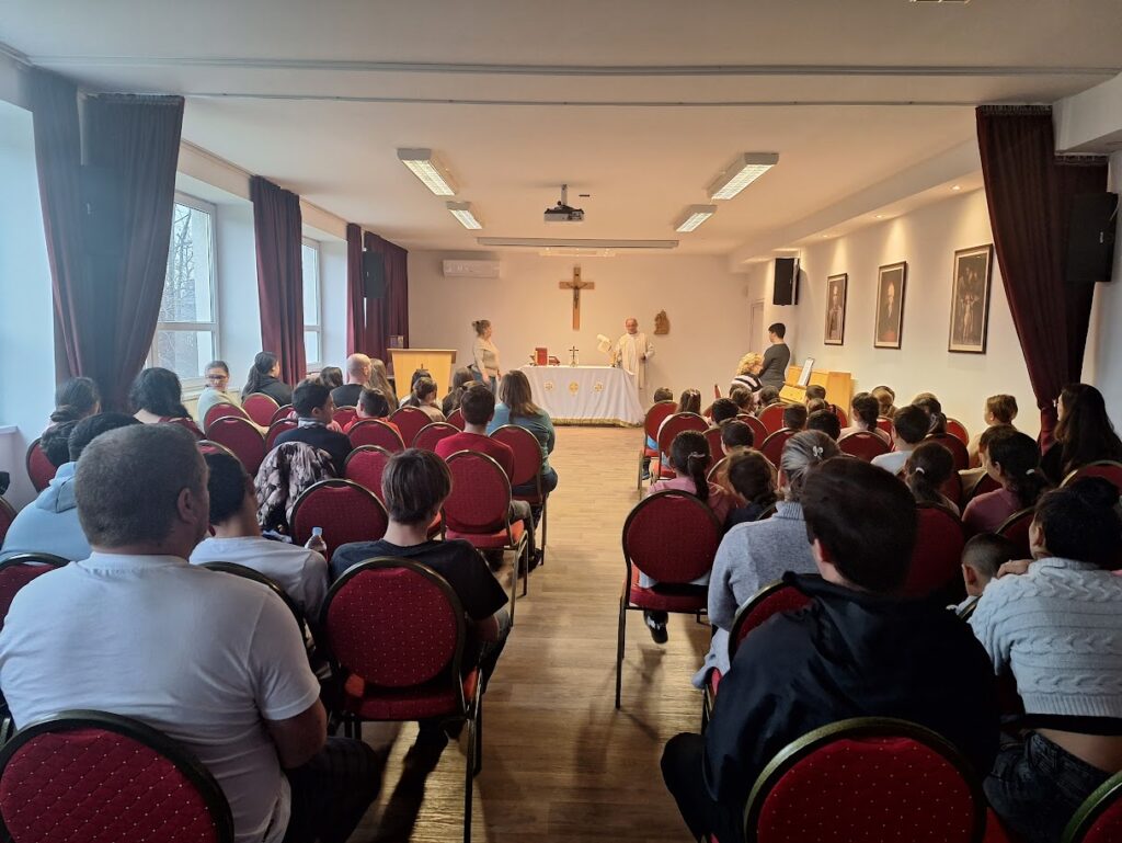 Az osztályok diák képviselői gyűltek össze az iskola hittantermében. Zsolt Atya a mise előtt „gyermeki” nyelven elmagyarázta a mai nap jelentőségét. Külön kitért az emberi, szülői szeretetre, Jézus kereszthalálára és az azt megelőző tanításaira, csodatételeire. „A keresztség az első a szentségek sorában. Bevezet bennünket Isten családjába, az Egyházba, Isten oltalmába helyez. Általa tagjává válunk egy olyan közösségnek, amely Istennel akar élni.”