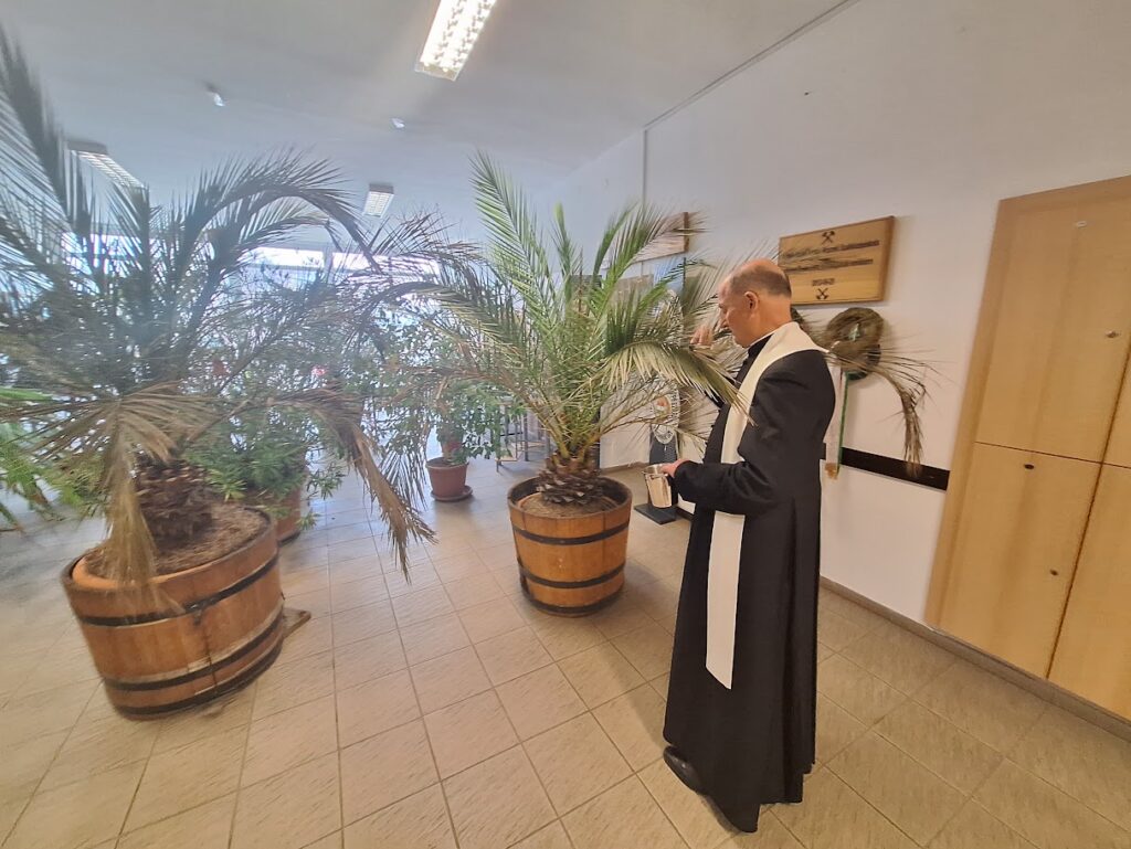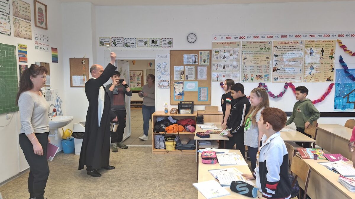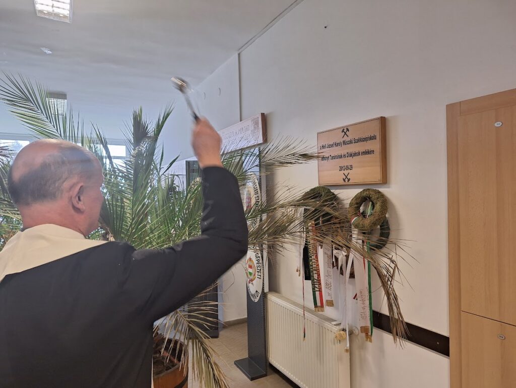 Ezt követően a vízszentelés következett, majd Zsolt Atya, – Oláh Éva (hittantanár) Tomka Dávid (ministráns) és Baranya István igazgató kíséretében – osztályról-osztályra járva megáldotta a helyiségeket, közösségi tereket, konyhát, birkozótermet, sportcsarnokot, Hell Múzeumot, tanári szobát, igazgatói irodát…stb.